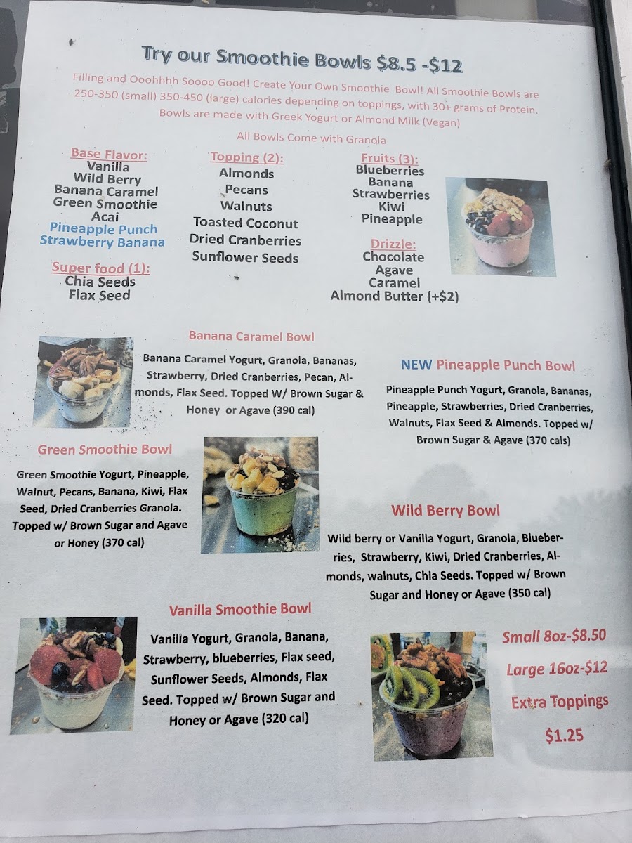 Create Your Own Smoothie Bowl! Base price includes Smoothie Base, Granola and Drizzle.