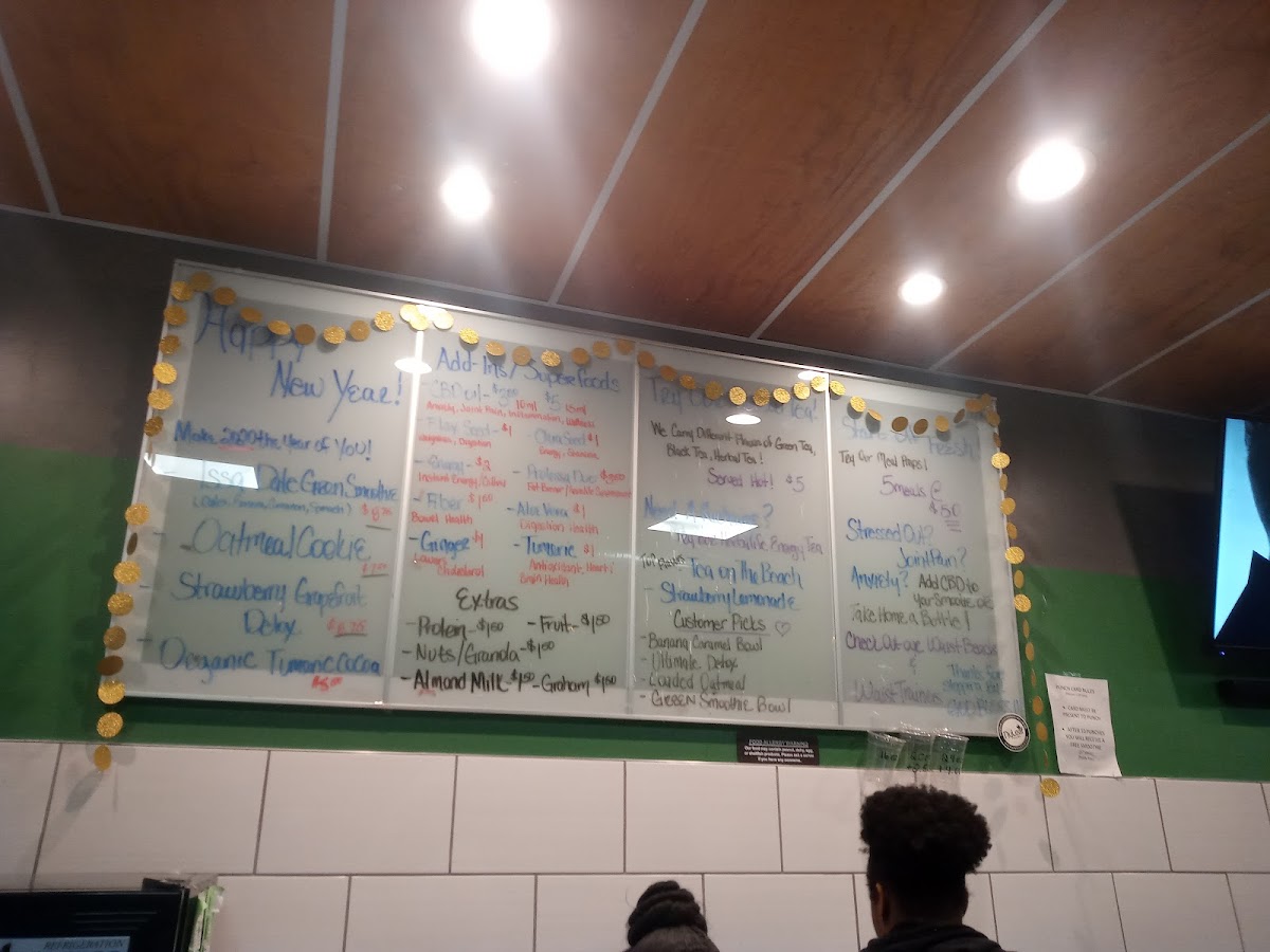 James St.Patrick Base (Spinach, Banana, Mango & Pineapple & Almond or Oat Milk or Yogurt) topped w/ Granola, Walnut, Pecans, Banana, Kiwi, Dried Cranberries, Chia Seeds and Light Agave